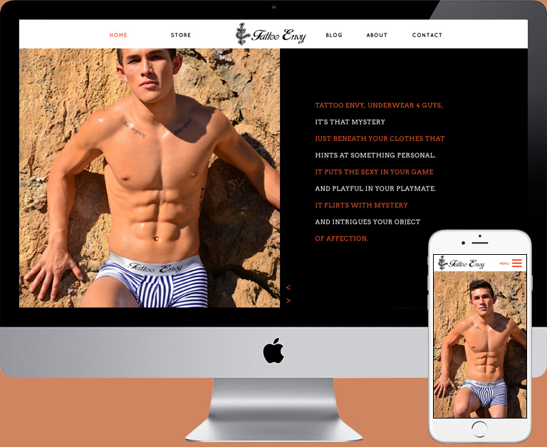 Tattoo Envy is an original man underwear brand with online store. They design and create their own collections inspired by Palm Springs' deserts and urban style. I was hired to create their website integrated into an e-commerce platform and to their Facebook page. Groovy yet very simple, the website scrolls horizontally and presents their unconventional collections, aimed to all kinds of man.