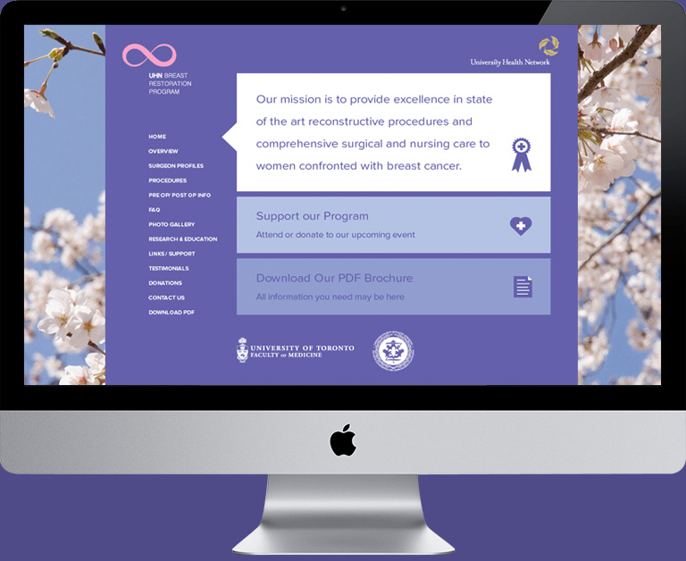 The Breast Restoration Program at University Health Network is a center of excellence that provides comprehensive treatment to post-mastectomy patients from all over Canada. In charge of a major rebranding, I brought a clean, serious, feminine, and optimistic style to their corporate image. The design of the website was focused on simplicity and functionality, while aligning with their new branding standards. One import issue was to balance a rational-scientific look to a feminine approach. While communicating reliability, the post-mastectomy women also need comfort and a boost to their self-esteem.