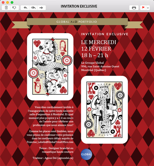 Global is a major Canadian manufacturer of office furnishings throughout the world. After a major renovation of its Montreal Showroom, a big opening party was prepared for the local A+D (Architects and Designers) community. Scheduled for February 12th, the party was themed with Valentine's Day motifs. Avoiding the most common clichés of the holiday, the e-mail invitation used playing cards elements to create a bold graphic style that clearly referred to the Valentine's spirit. It also flattered the guests by calling them "kings" and "queens", and prepared them to be welcomed by the (performers) King and Queen of Hearts at the entrance of the party.