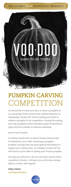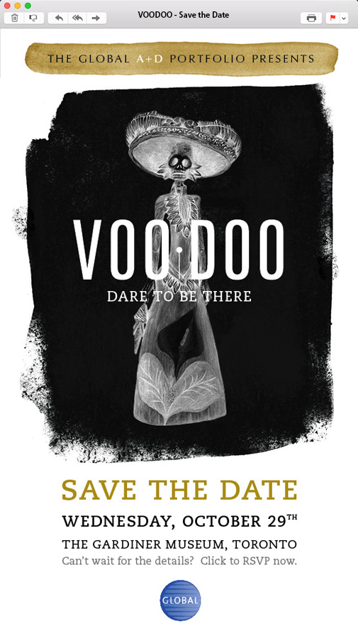 Global is a major Canadian manufacturer of office furnishings throughout the world. Their annual A+D (Architects & Designers) party is considered to be one of the best events of the industry. In 2014 it was placed at the Gardiner Museum and celebrated Halloween, inspired by the voodoo and day-of-the-dead aesthetics. The series of email invitations caused a great impression and the maximum number of guests with RSVP was quickly reached.