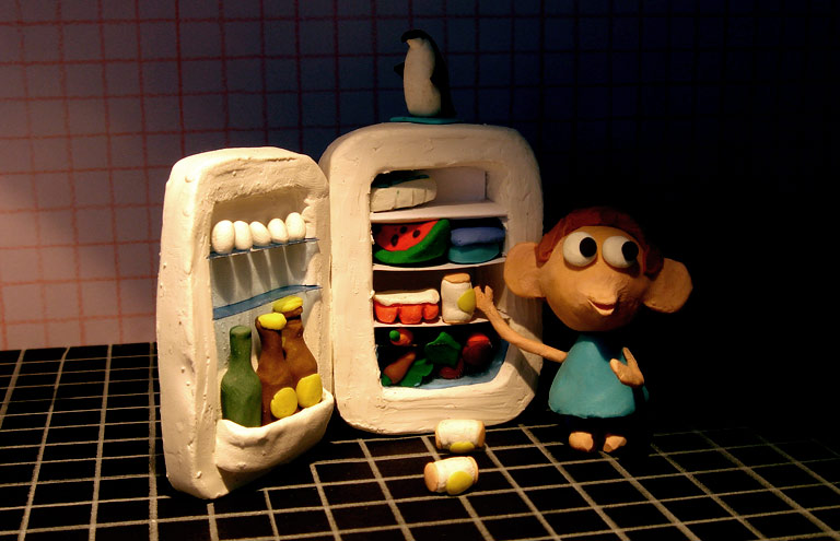This picture illustrates an article about alcohol use among youth. The text emphasizes the problem that often starts at home due to easy access to drinks in the fridge. The illustration tries to capture the expression of a kid who knows that is doing something wrong. Made of plastic clay and colored paper, illuminated and photographed, this series of illustrations was created for Nós da Escola magazine, a MultiRio monthly publication aimed at teachers. The cartoon-humor style was used to illustrate controversial themes, which rarely had any photography.