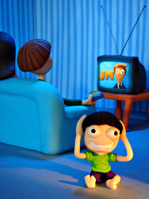 This picture illustrates an article on how children feel about adult TV shows. Many times, forced to watch what their parents choose because they rule the remote control, kids get an early exposure to violence and sex on TV. In Brazil, where the article was published, it is shown every day on TV news and soap operas. The illustration tries to show how damaging it may be for a child, despite adults’ indifference. Made of plastic clay and colored paper, illuminated and photographed, this series of illustrations was created for Nós da Escola magazine, a MultiRio monthly publication aimed at teachers. The cartoon-humor style was used to illustrate controversial themes, which rarely had any photography.