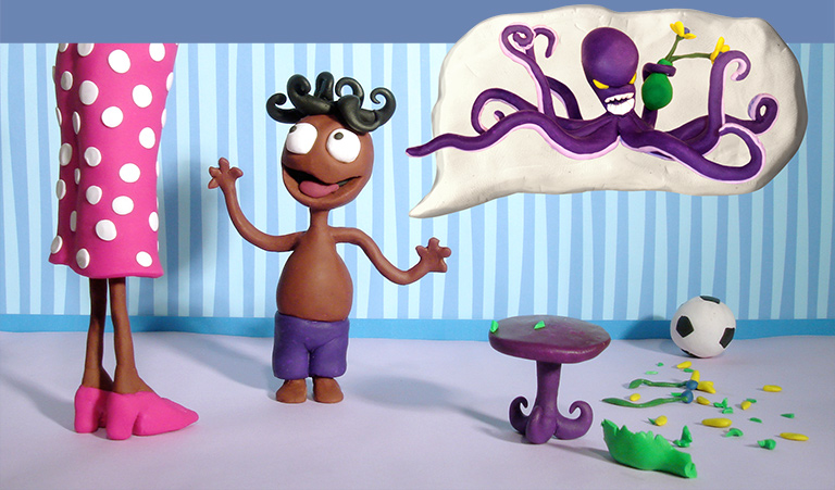 This picture illustrates an article about the creative lies that children tell. With no words and just one still image, I tried to create a narrative in which a boy, who had broken a flower pot with a soccer ball, is reprehended, and comes up with a fantastic story about a giant octopus to blame it for the accident. Made of plastic clay and colored paper, illuminated and photographed, this series of illustrations was created for Nós da Escola magazine, a MultiRio monthly publication aimed at teachers. The cartoon-humor style was used to illustrate controversial themes, which rarely had any photography.