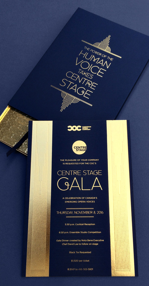 Run by the Canadian Opera Company, Centre Stage is a premier national fundraiser dedicated to the discovery and celebration of the next generation of opera stars. The main event, the Ensemble Studio Competition, brings the most talented voices to a thrilling night, followed by a special gala dinner. At BT/A Advertising, I was in charge of the whole identity of the 2016 event, including the luxurious printed invitation. Inspired by art Deco opera houses, the premium invitations were nested in a premium deep blue box with golden sleeve. The strong concept, sophisticated details and perfect manufacturing by Colour Innovations scored a shiny trophy at the Canadian Printing Awards 2016.