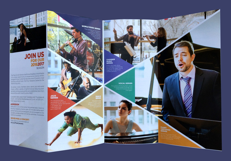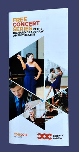 The COC Free Concert Series takes place in one of Toronto's most breathtaking and intimate spaces: the Richard Bradshaw Amphitheatre.  There, artists from around the world share their talent and passion in six series: vocal, piano, jazz, dance, chamber and world music. At BT/A Advertising, I designed their 2016/2017 brochure. Vibrant yet sophisticated, the  hexagon mosaic of styles spreads the musical imagery through the pages.