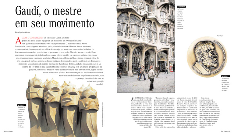 O Globo is one of the most important newspapers in Brazil. It is part of a huge communications conglomerate, which includes open and cable TV channels, Internet services, radios and publishing houses spread all over Brazil. This page was published on March 14th, 2002, in the travel magazine. It presents an article on and Gaudí's legacy in Barcelona.